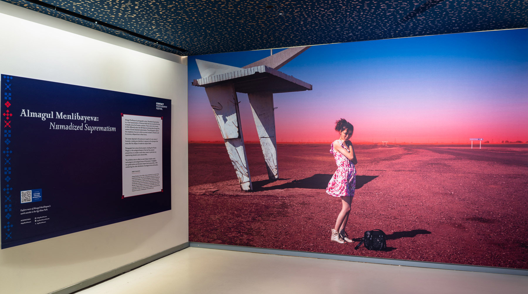 In Nomadized Suprematism, Menlibayeva reimagines the Silk Roads through the lens of Soviet industrialization, capturing how these historical shifts affected the nomadic civilization of Eurasia. This photographic series addresses the collapse of traditional economies and the emergence of new identities, especially among women, in response to the dystopia caused by the fall of modernist ideals. The exhibit in the museum's lower level critiques the socio-cultural, technological, and ecological challenges of the present, particularly highlighting the disproportionate ecological burden placed on local communities. Menlibayeva's work urges reflection on the global consequences of local actions and decisions.